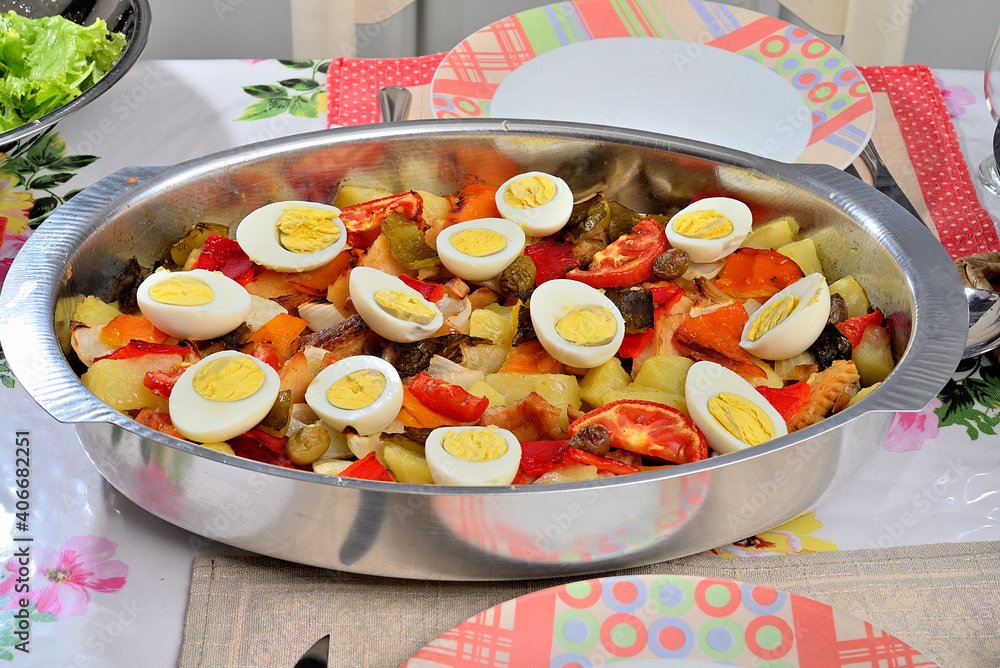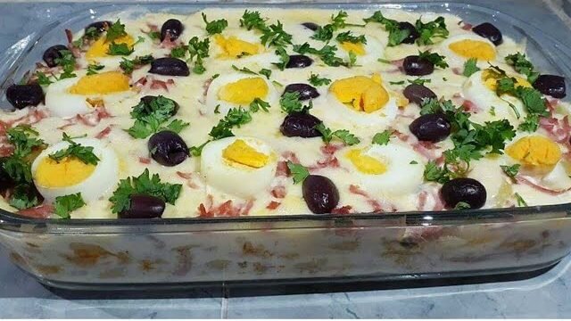 - Montagem por Camadas: Em um refratário, faça uma “cama” com as batatas. Por cima, espalhe a cebola e os pimentões. Acomode as rodelas de ovo e as azeitonas por toda a travessa.